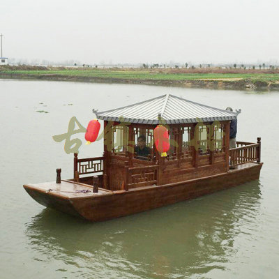 畫(huà)舫船就是裝飾古典華麗的游船,是"中國(guó)風(fēng)"的仿古游船,結(jié)合古典園林建筑,體現(xiàn)了中華文明的古典藝術(shù).畫(huà)舫船豪華而又古典,船上的建筑按照中國(guó)古代建筑里的亭臺(tái)樓閣,建筑工藝之復(fù)雜,要求之嚴(yán)格,仿古畫(huà)舫游船的特點(diǎn)飛檐翹角、玲瓏精致的四角亭子逐漸成形,赫然立于船頭,美人靠、盤(pán)龍柱子、彩畫(huà)……龍柱上的浮雕盤(pán)龍和祥云一層扣著一層,層層錯(cuò)落有致,雕刻精細(xì)到盤(pán)龍身上的每一個(gè)鱗片都細(xì)細(xì)可數(shù),古代皇家標(biāo)志性元素,在畫(huà)舫船上體現(xiàn)的淋漓盡致。除了雕刻、花窗,整條船還有一個(gè)看點(diǎn),那就是弧線(xiàn)優(yōu)美、高高翹起的船尾。游船并不大,長(zhǎng)約10米、寬3米,但是整體看起來(lái)堪稱(chēng)一件藝術(shù)品。船尾的雕花欄桿與船艙、船頭的雕刻遙相呼應(yīng),船身四周貼著浮雕祥云,給整條船增添了富貴、華麗的氣質(zhì)。